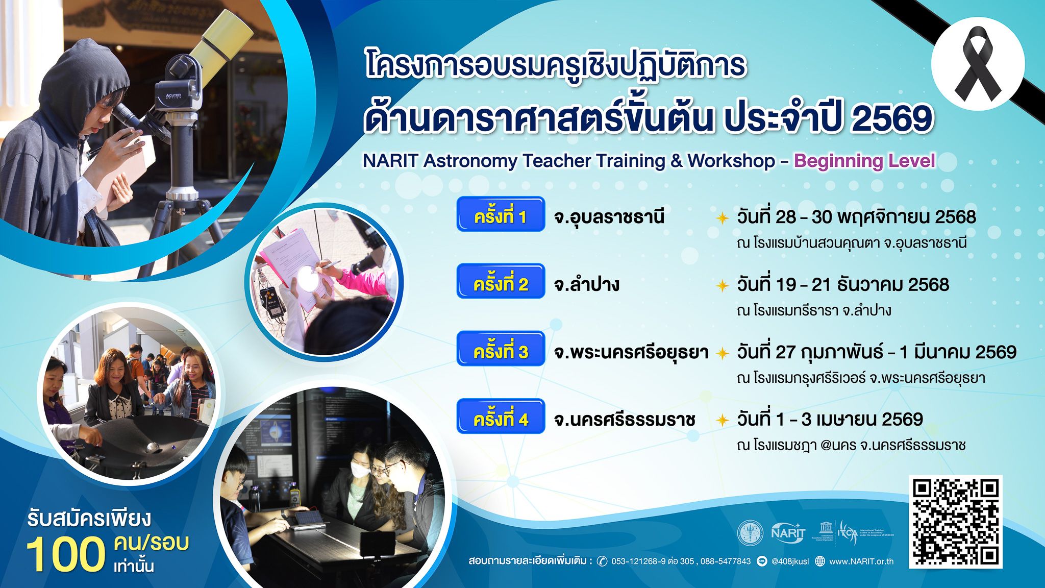สถาบันวิจัยแห่งชาติ (องค์การมหาชน) กระทรวงการอุดมศึกษา วิทยาศาสตร์ วิจัยและนวัตกรรม กำหนดจัดโครงการอบรมครูเชิงปฏิบัติการด้านดาราศาสตร์ขั้นต้น ประจำปี 2569 มีวัตถุประสงค์เพื่อมุ่งเน้นให้ผูเ้ข้าร่วมอบรมได้รับความรู้และทักษะทางดาราศาสตร์พื้นฐาน การใช้อุปกรณ์พื้นฐานเพื่อศึกษาและสังเกตการณ์ทางดาราศาสตร์ การนำความรู้และประสบการณ์ไปประยุกต์ใช้ในการเรียนการสอนวิชาดาราศาสตร์ในชั้นเรียน รวมทั้งเป็นการสร้างแรงบันดาลใจทางด้านดาราศาสตร์แก่ครูผู้เข้าร่วมอบรม โดยในปีงบประมาณ 2569 สถาบันฯ กำหนดให้มีการอบรมขั้น 4 ครั้ง ได้แก่ จังหวัดอุบลราชธานี จังหวัดลำปาง จังหวัดพระนครศรีอยุธยา และจังหวัดนครศรีธรรมราช