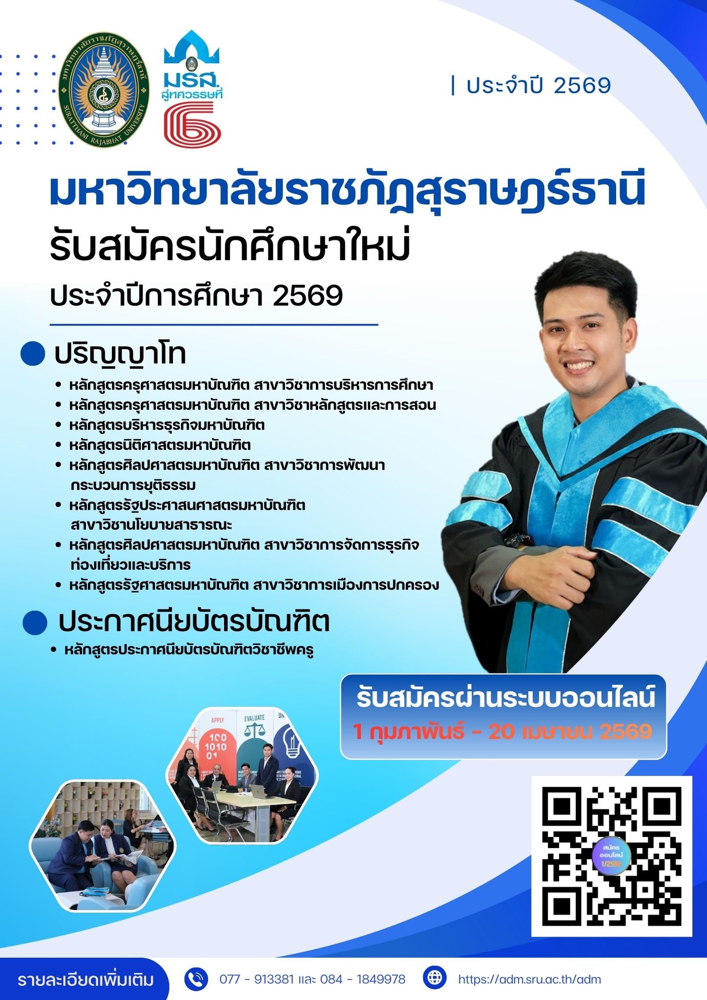 มหาวิทยาลัยราชภัฏสุราษฎร์ธานี เปิดรับสมัครสอบคัดเลือกนักศึกษาระดับปริญญาโท และหลักสูตรประกาศนียบัตรบัณฑิตวิชาชีพครูประจําภาคเรียนที่ 1/2569