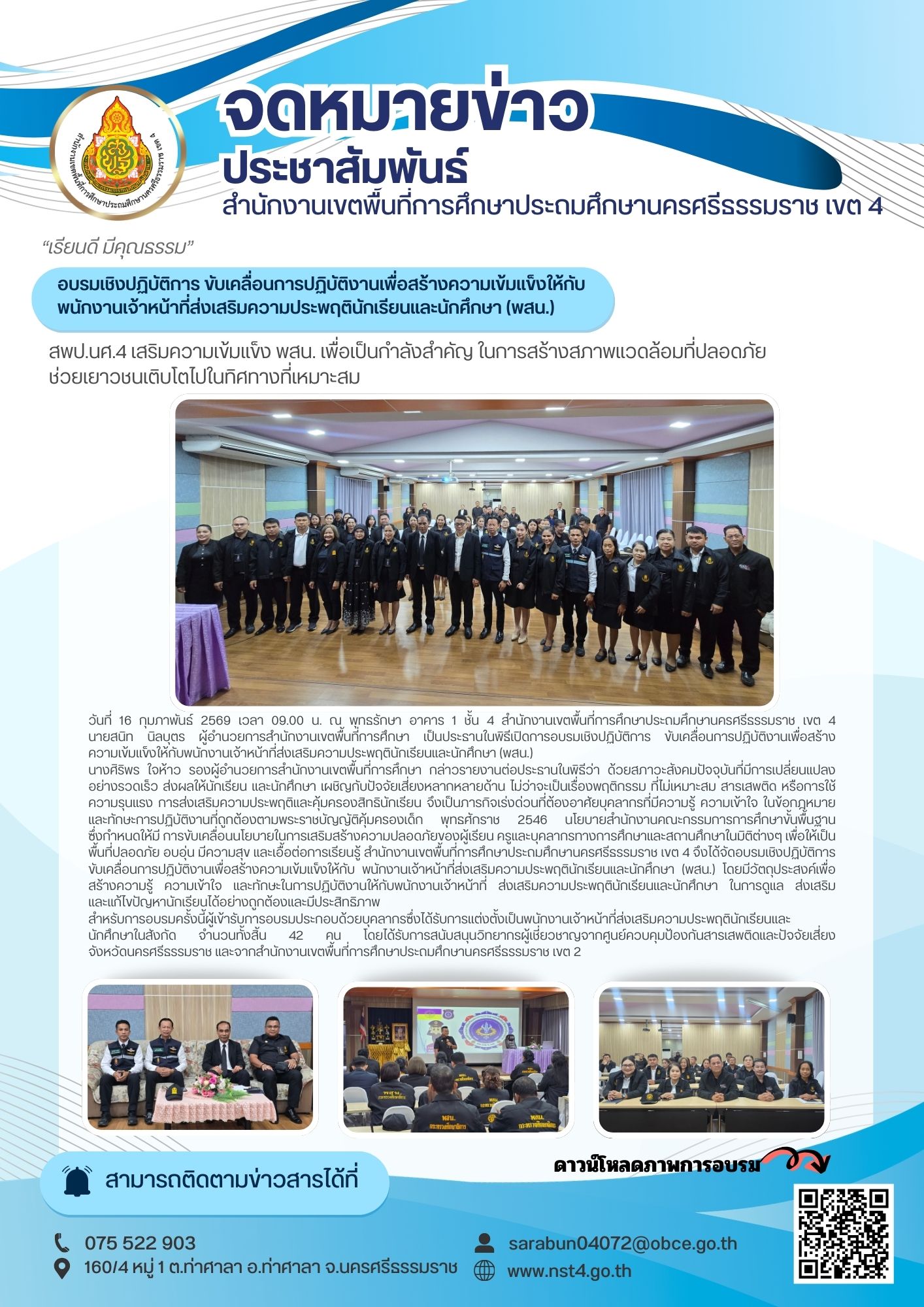 สพป.นศ.4 เสริมความเข้มแข็ง พสน. เพื่อเป็นกำลังสำคัญ ในการสร้างสภาพแวดล้อมที่ปลอดภัย ช่วยเยาวชนเติบโตไปในทิศทางที่เหมาะสม