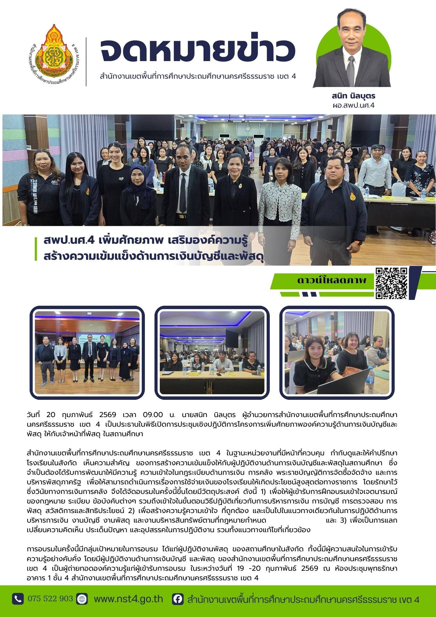 วันที่ 20 กุมภาพันธ์ 2569 เวลา 09.00 น. นายสนิท นิลบุตร ผู้อำนวยการสำนักงานเขตพื้นที่การศึกษาประถมศึกษานครศรีธรรมราช เขต 4 เป็นประธานในพิธีเปิดการประชุมเชิงปฏิบัติการโครงการเพิ่มศักยภาพองค์ความรู้ด้านการเงินบัญชีและพัสดุ ให้กับเจ้าหน้าที่พัสดุ ในสถานศึกษา